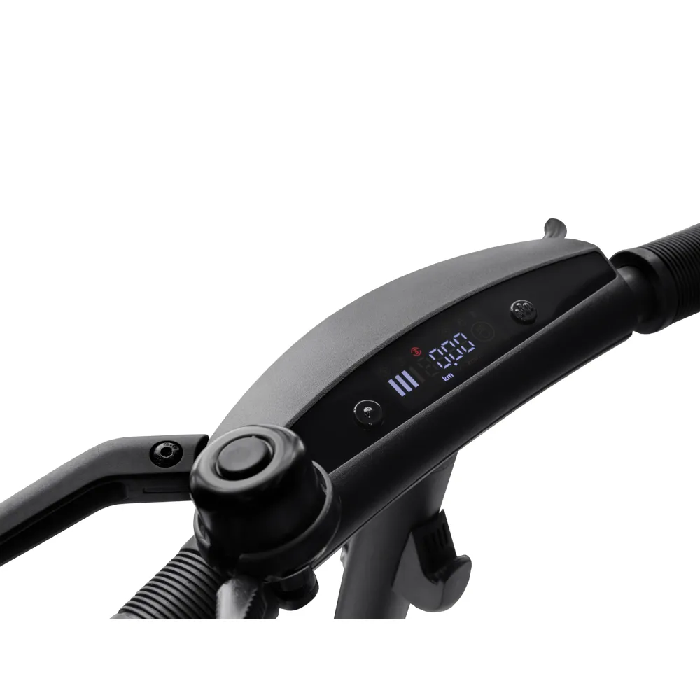 У электросамоката имеется встроенный бортовой компьютер, при помощи которого, вы всегда будете знать об уровне заряда аккумулятора, режиме ходовых огней, пройденном расстоянии, скорости и выбранном скоростном режиме.