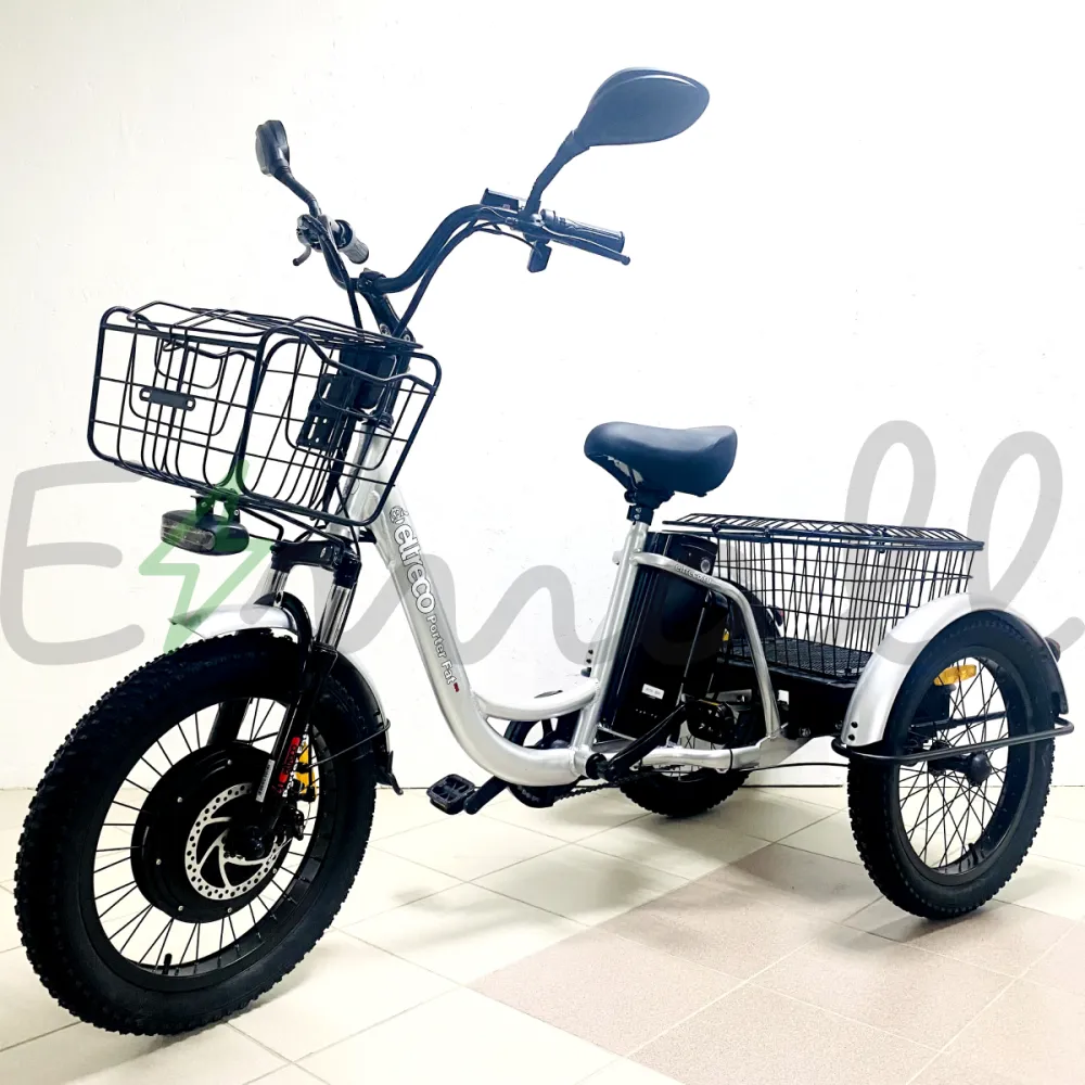ТРИЦИКЛ ELTRECO PORTER FAT 500 – это трехколесный грузовой велосипед, который имеет мощный электродвигатель в 500W. Он справится с любой трудной задачей. Его можно эксплуатировать на даче, на придомовом участке, при перевозке продуктов или небольших грузов. Он комфортен даже при обычной велопрогулке, в багажнике можно разместить рюкзак/сумку, необходимый инвентарь.